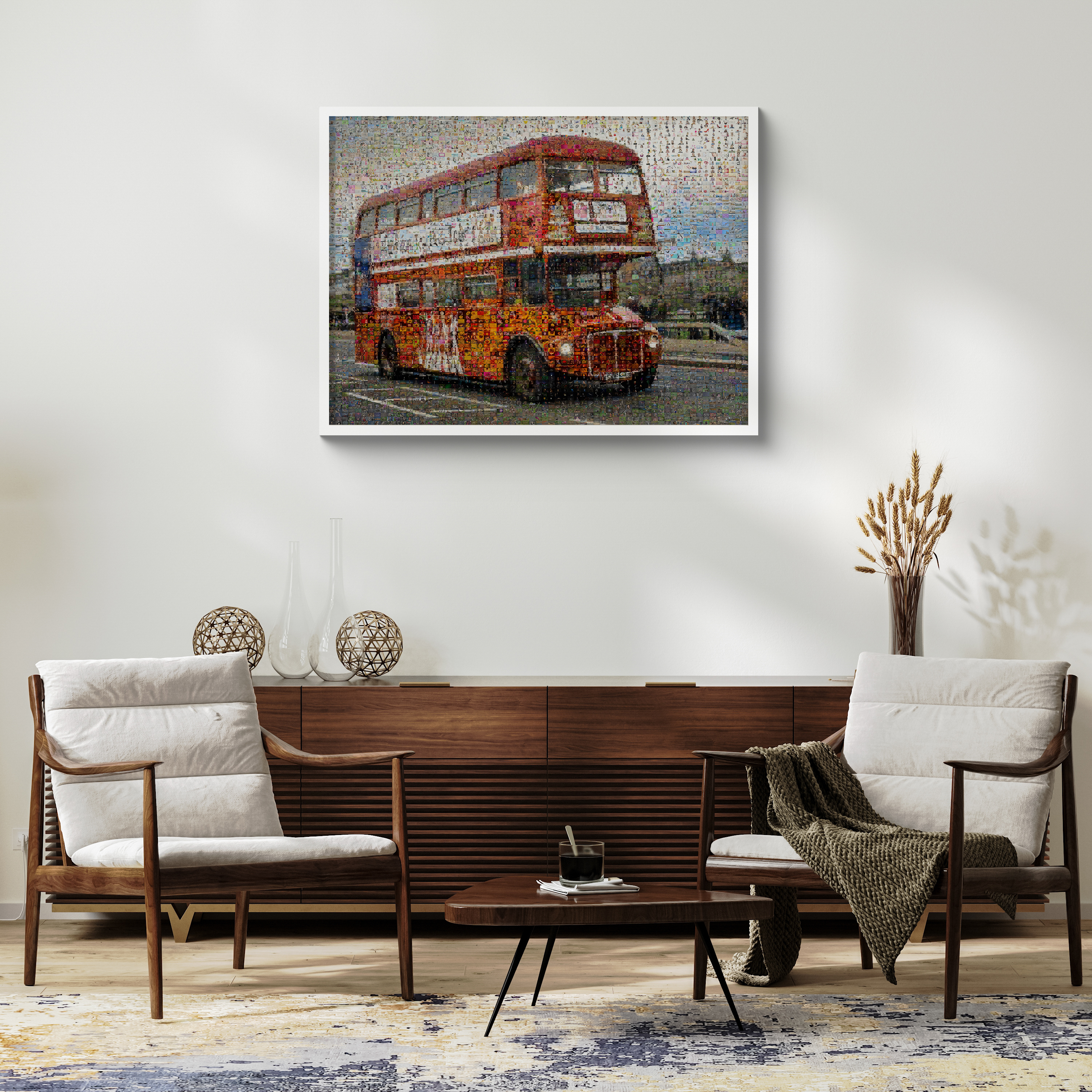 Mosaïque unique: Bus londonien en photos, souvenir stylé de voyage pour déco ou cadeau.