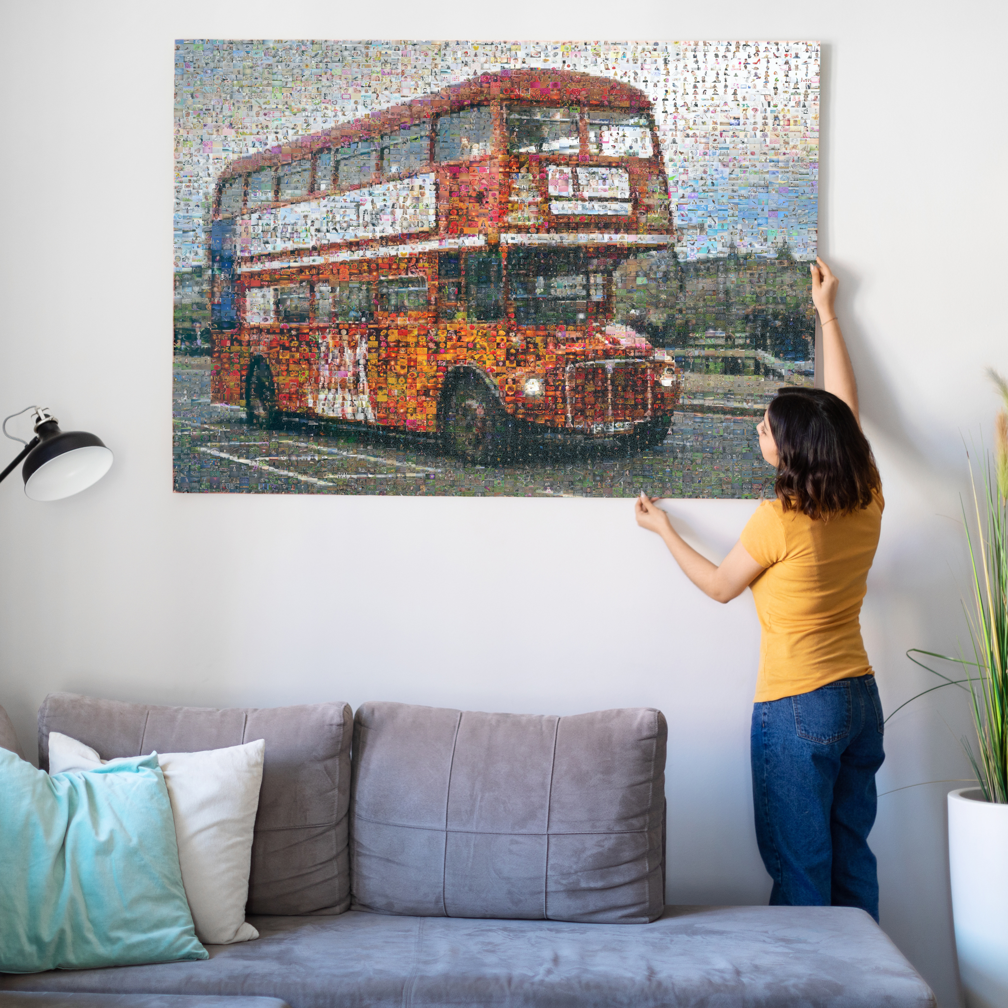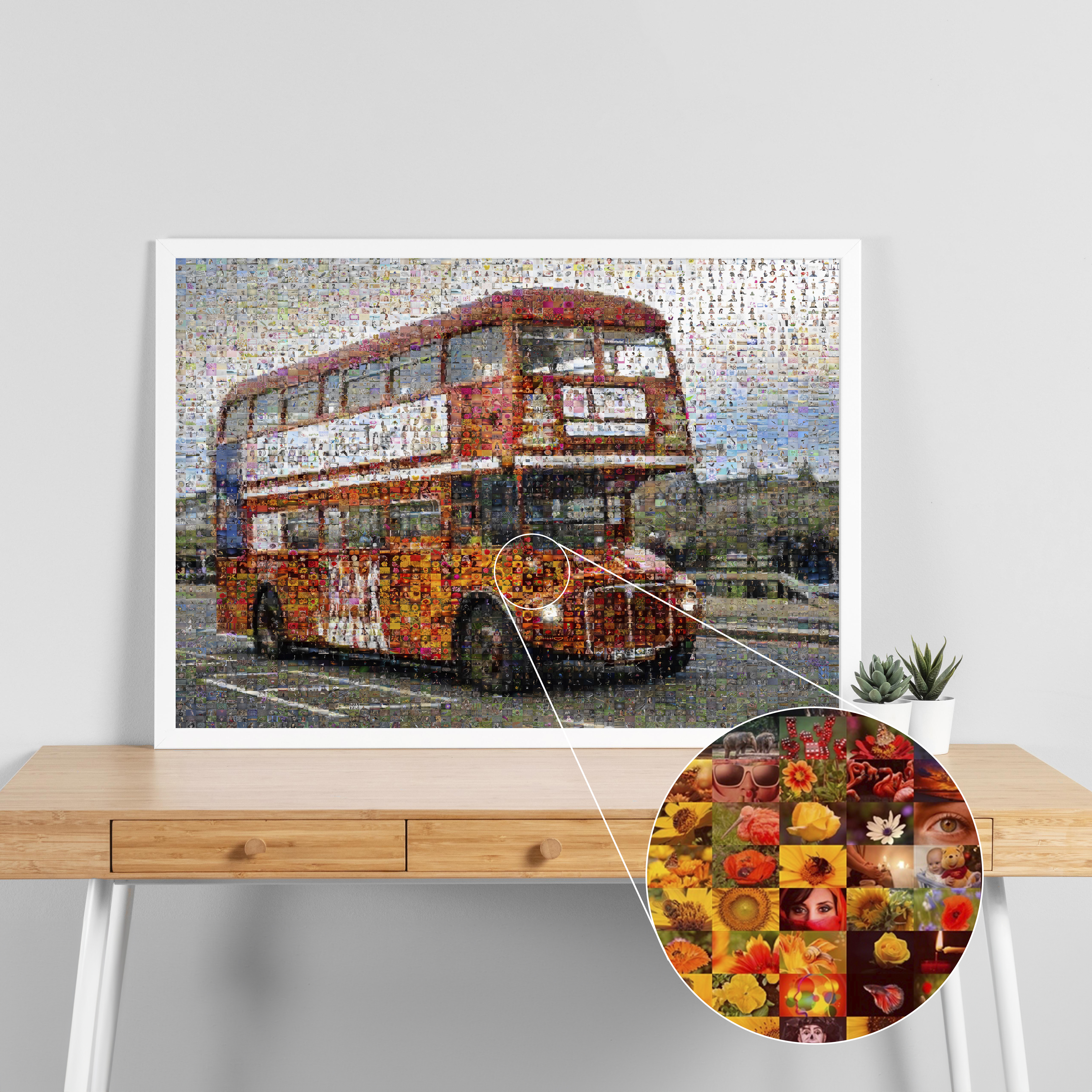 Créez votre propre chef-d'œuvre personnalisé avec notre impression individuelle de mosaïque photo. Imaginez un bus rouge à impériale de Londres, composé de vos souvenirs de voyage inoubliables. Ce produit unique est parfait pour les amateurs de voyages, les familles et les amis qui souhaitent immortaliser leurs souvenirs communs. Offrez un cadeau surprenant ou embellissez votre maison.